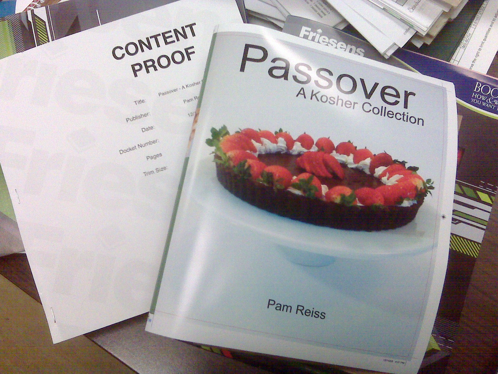 On Monday, the files for Passover a Kosher Collection were due at the printer, so every spare moment leading up to Monday was spent proofing and worrying and making small changes here and there. We’ve had some problems with colour management — the colours as they appear on my monitor are not the same as the colours as they print on my laser printer, which are different from the colours that print on my ink jet, which are different from the colours on the proofs from my printer (which, btw, are different depending on which printer they use – high resolution proofs versus lower resolution proofs). So I’ve spent a lot of time tweaking colours.