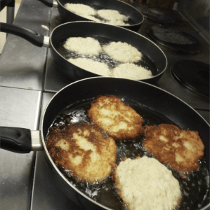 Remember – Chanukah is a holiday that calls for eating things fried with oil. So I use oil to pan-fry all of the latkes. If you are looking for a lighter version, you can spray a non-stick frying-pan with vegetable spray – but be warned – the results will not be the same. For crisp on the outside, soft on the inside latkes use the oil. (You are commemorating a miracle!)
