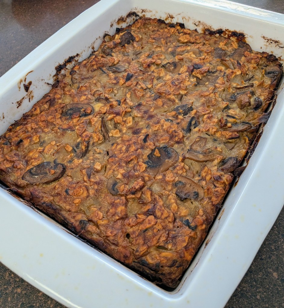 Since people are looking for it, I thought it would be a good idea to share my recipe for my Passover Mushroom & Onion Kugel. It’s very similar — simple and tasty, but uses farfel (broken up matzo) rather than noodles. Can be made ahead and freezes well.