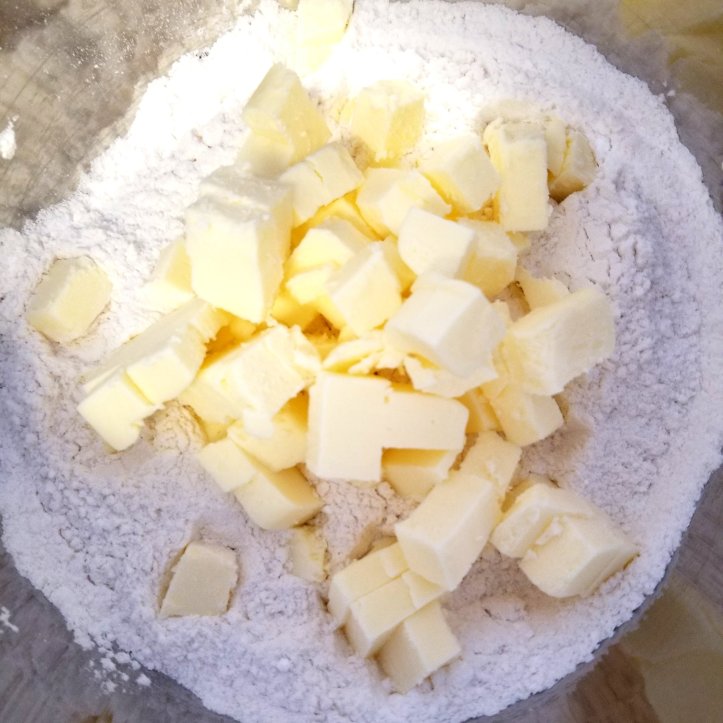 Add the cold butter and use a pastry cutter if you have one to break up the butter and mix it in. If you don’t have a pastry cutter, you can use your hands – just toss the butter and the flour so that the butter is coated in flour, then use your fingertips to press the butter into the flour, breaking it up until the butter is in smaller, pea-size chunks.