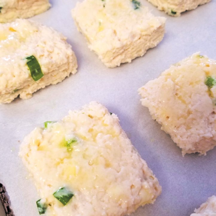 At this point, you can use cookie cutters to cut circles or other shapes, but I usually just cut the dough into 12 equal size squares. Gently pull the squares apart and space them out so there is about one inch of space surrounding each biscuit. They’re going to grow as they bake so they need a little room.
