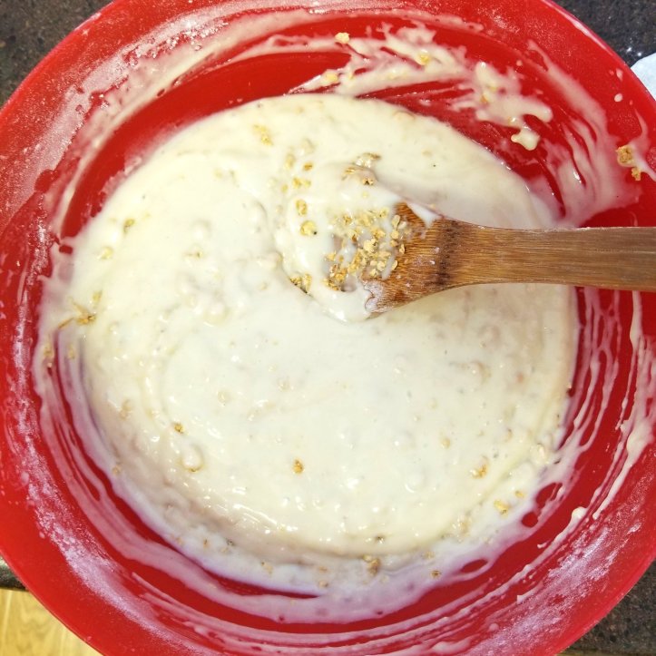 Add the salt, baking powder and baking soda and mix in. Add the flour and stir until JUST combined. You don’t want to overmix the batter and having some small lumps is good. Add the granola and stir through.
