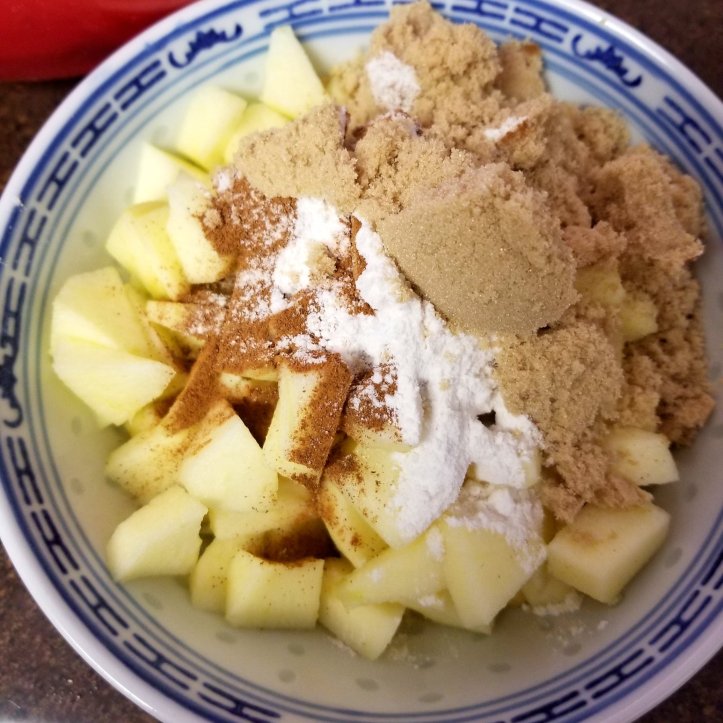 In another bowl, combine the diced apples, 1 Tbsp flour, cinnamon and brown sugar. Stir together until all of the apples are coated in the sugar/ flour/ cinnamon mixture.