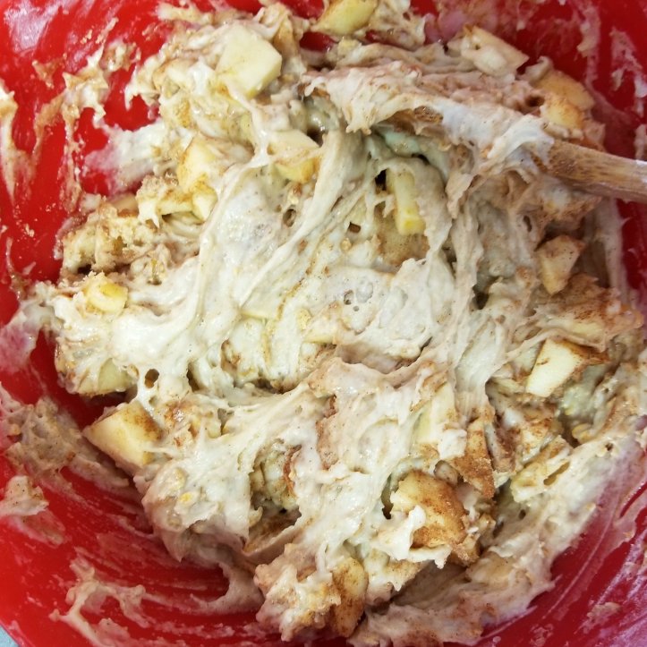Add the apples to the batter, including any excess sugar that may be at the bottom of the bowl. Gently stir the apples into the batter. Don’t worry about the apples being enveloped in better – you should see lots of chunks of apples and streaks of the cinnamon/ sugar should still be visible.