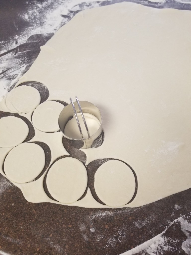 Roll the dough out to 1/8″ – 1/4″ thick (I like to roll the dough for soup kreplach on the thinner side and for other kreplach/verenekes on the thicker side). You can make these as large as you like, but I typically use a 2-inch cookie cutter to cut circles.