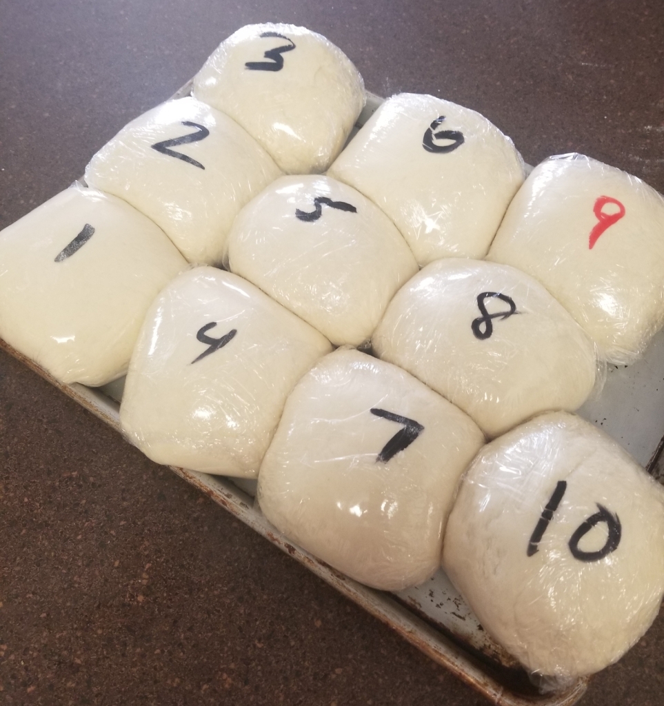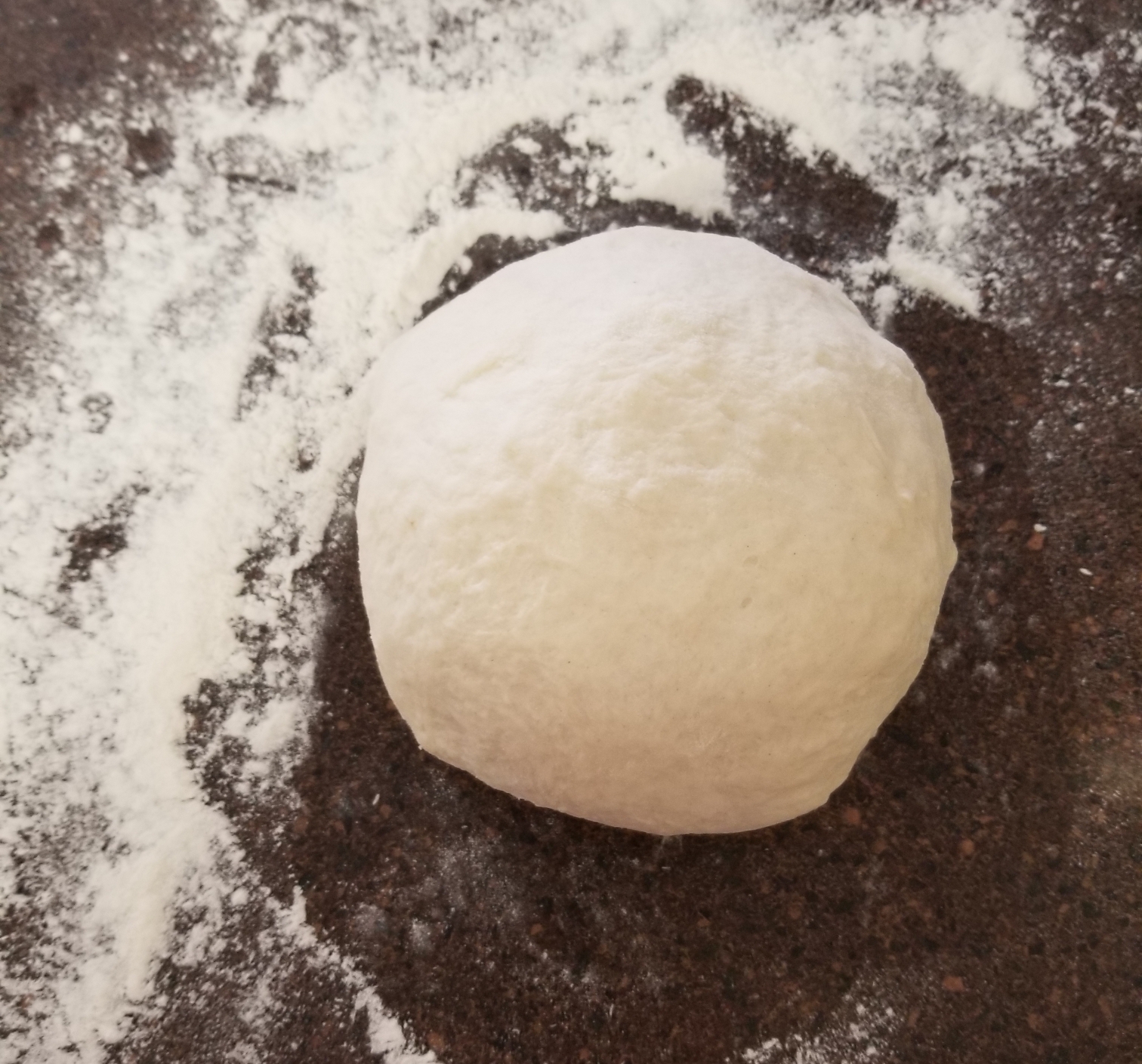 After it’s rested and relaxed unwrap one dough ball and place it on a lightly floured counter.