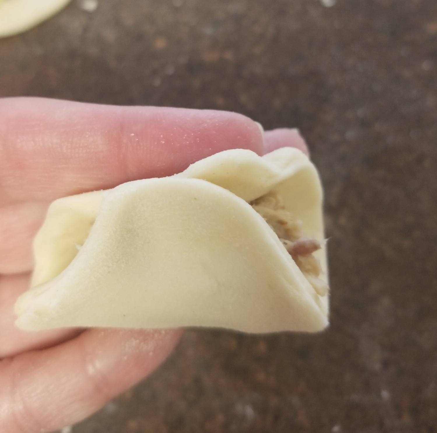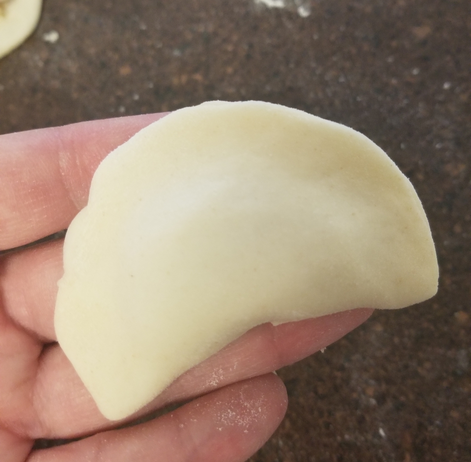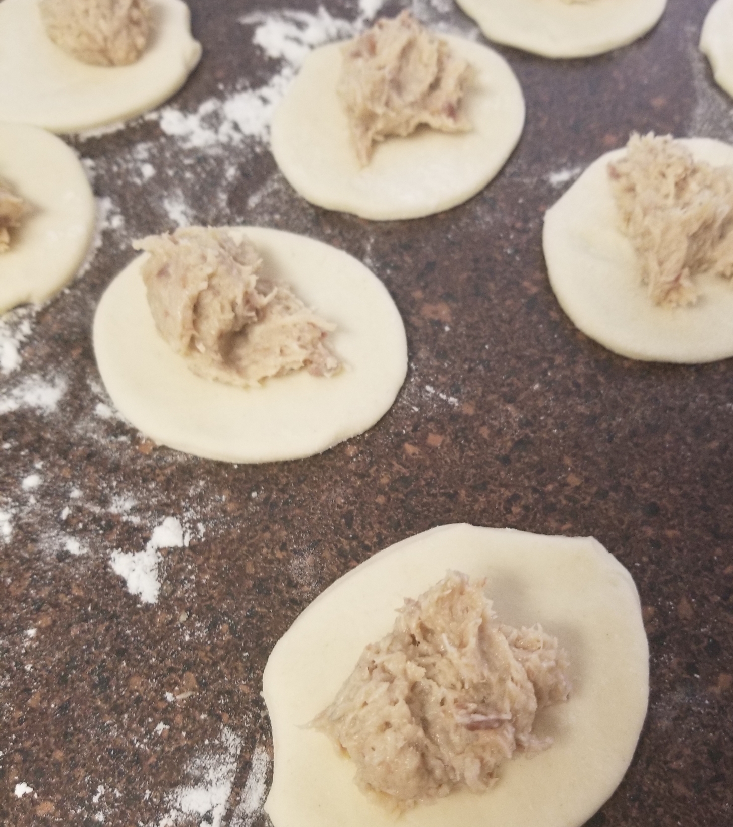 Roll the dough out to approximately 1/8-inch thick. I use a 2″ cookie cutter to cut circles in the dough, then place a scoop of filling on each round (approximately 1 Tbsp of filling).
