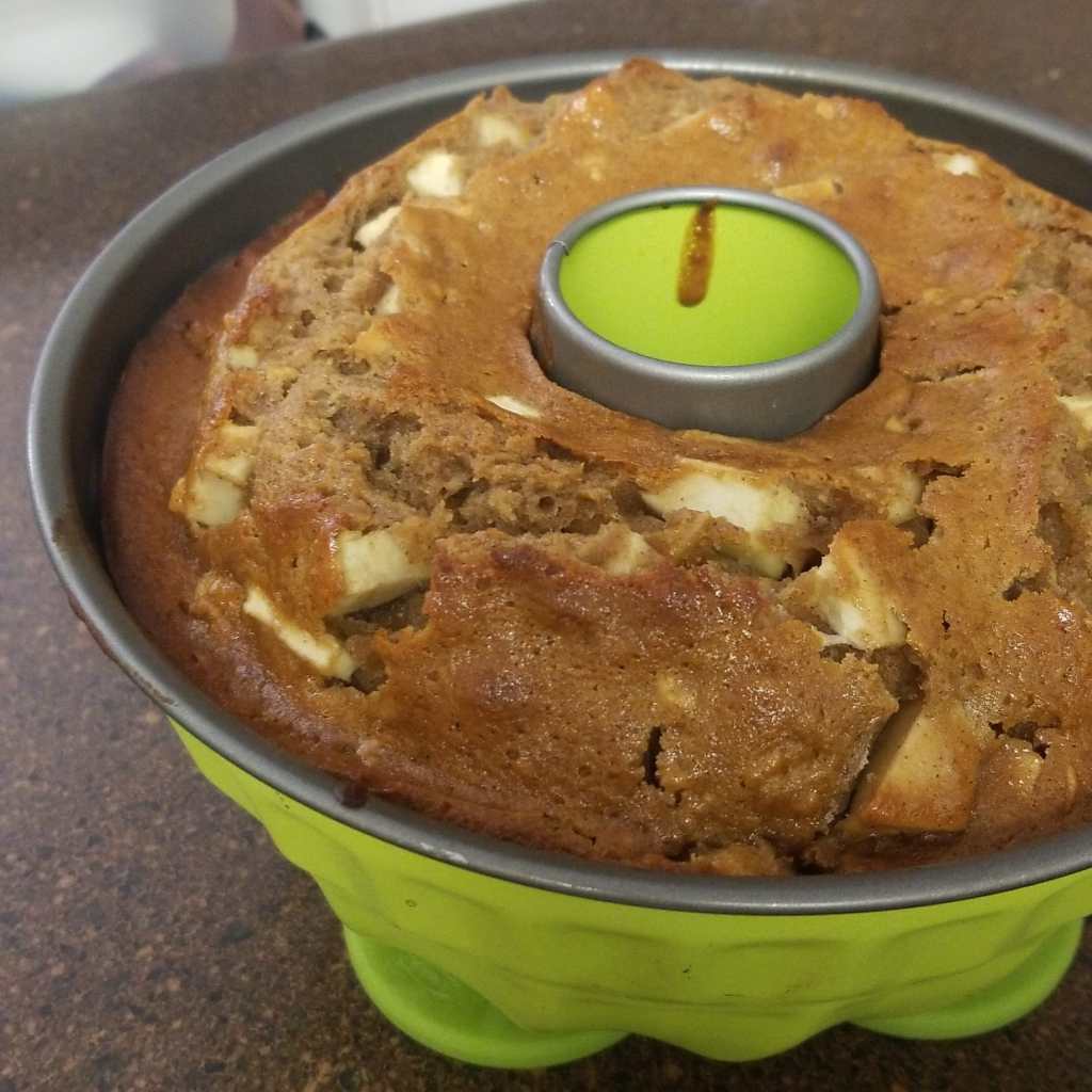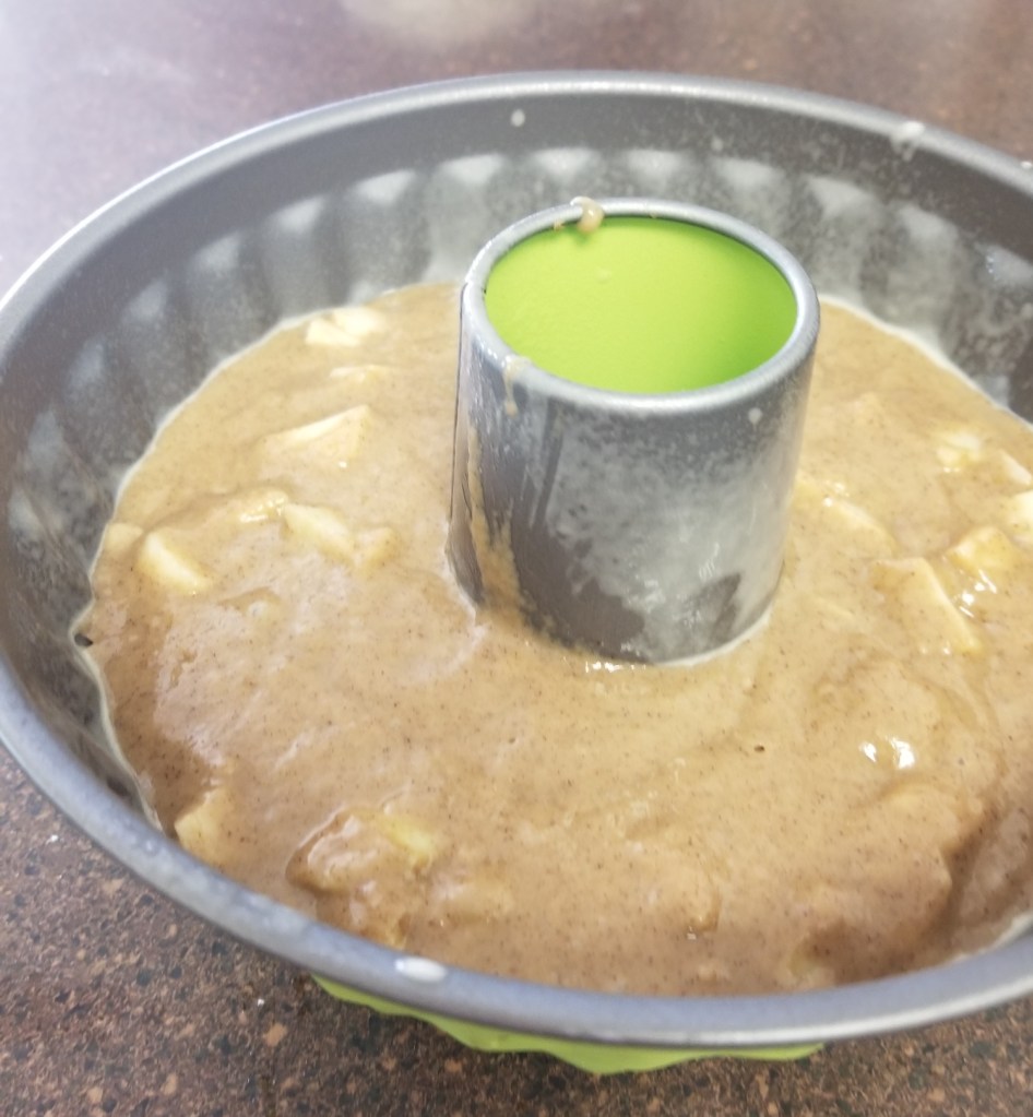 Pour the batter into the prepared bundt pan, using a spatula to make sure the apples are distributed throughout the cake.