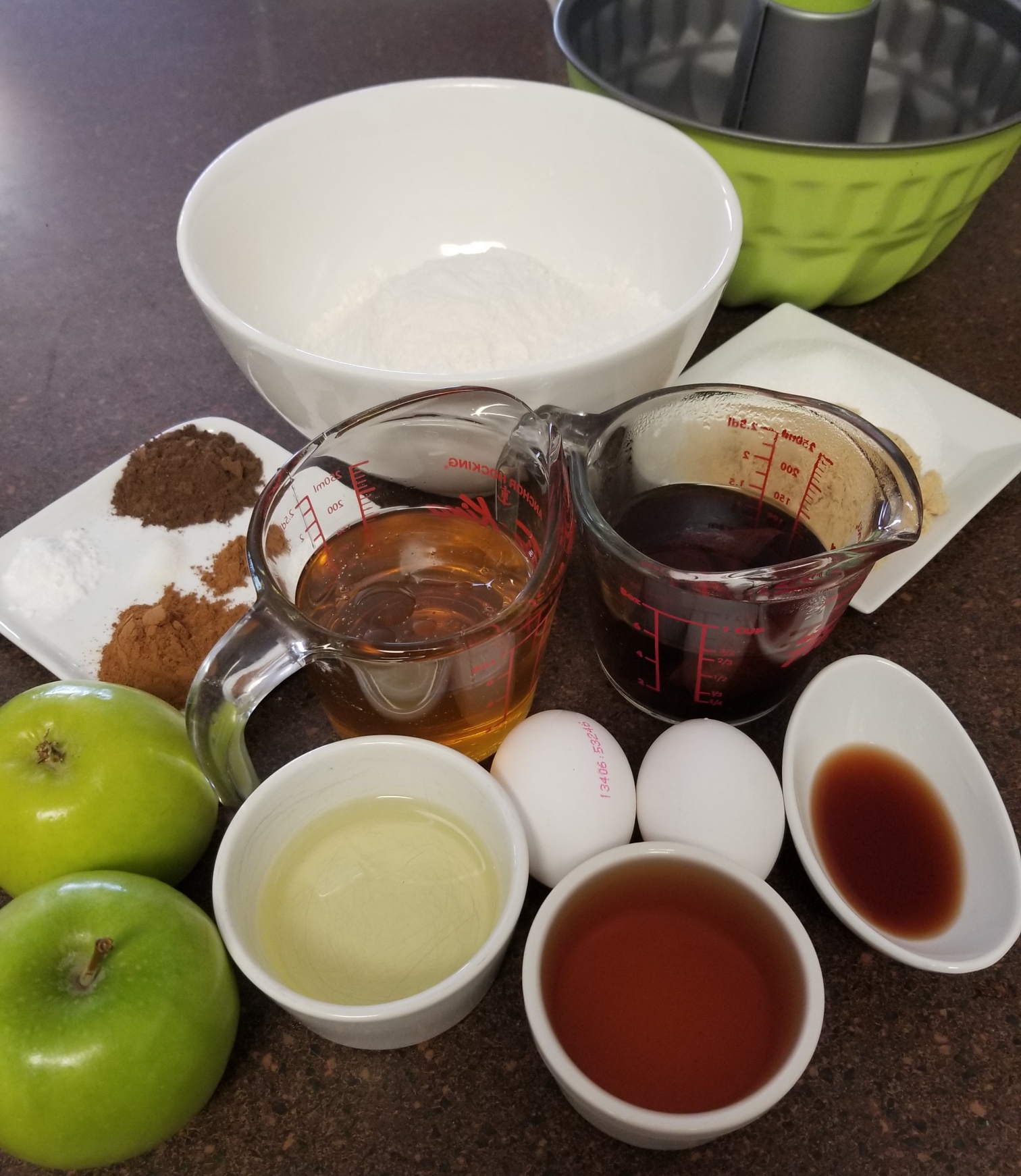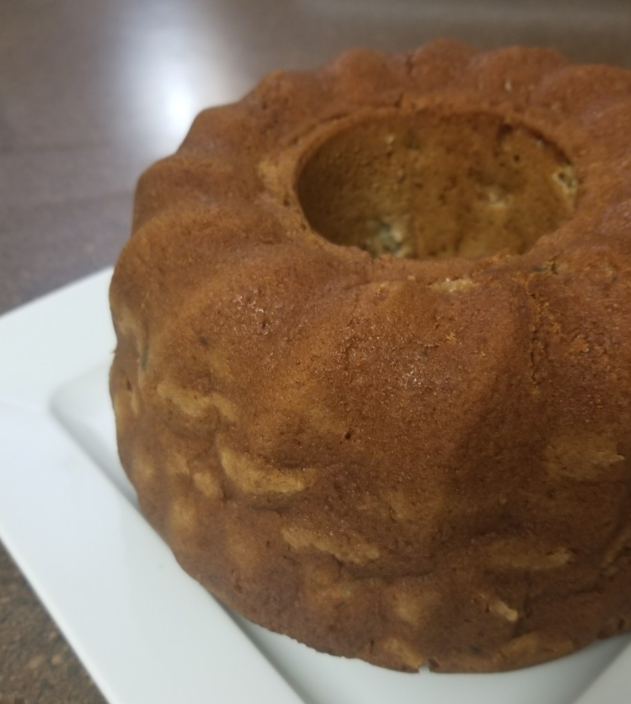 This recipe makes a slightly smaller cake than the typical recipes and works perfectly for my 10 cup non-stick bundt pan. You can make it in a 12-cup pan, but it will be a little lower when done. Once it’s cooled, wrap it well and it will keep on the counter for a few days. You can also bake it ahead and freeze it.