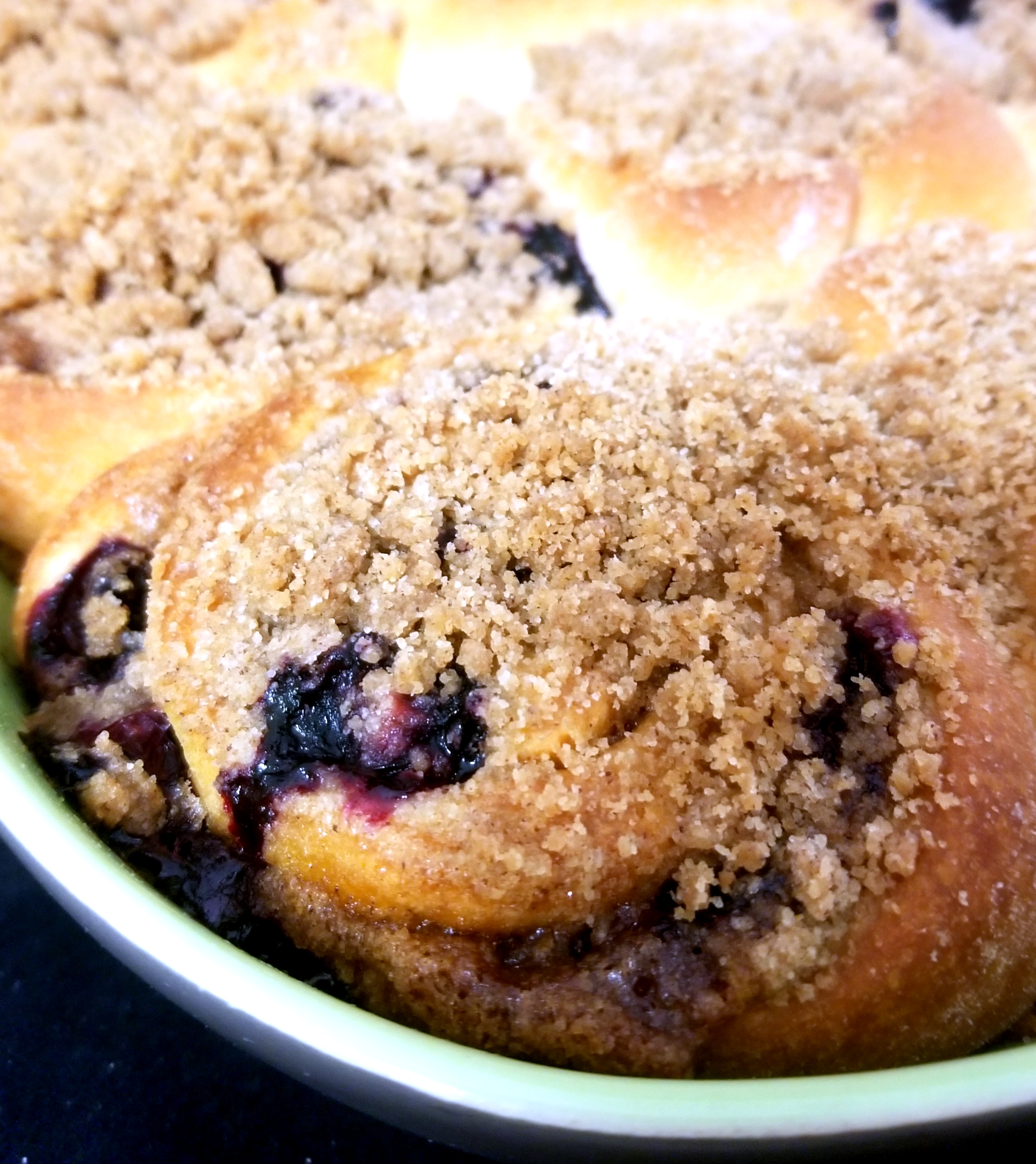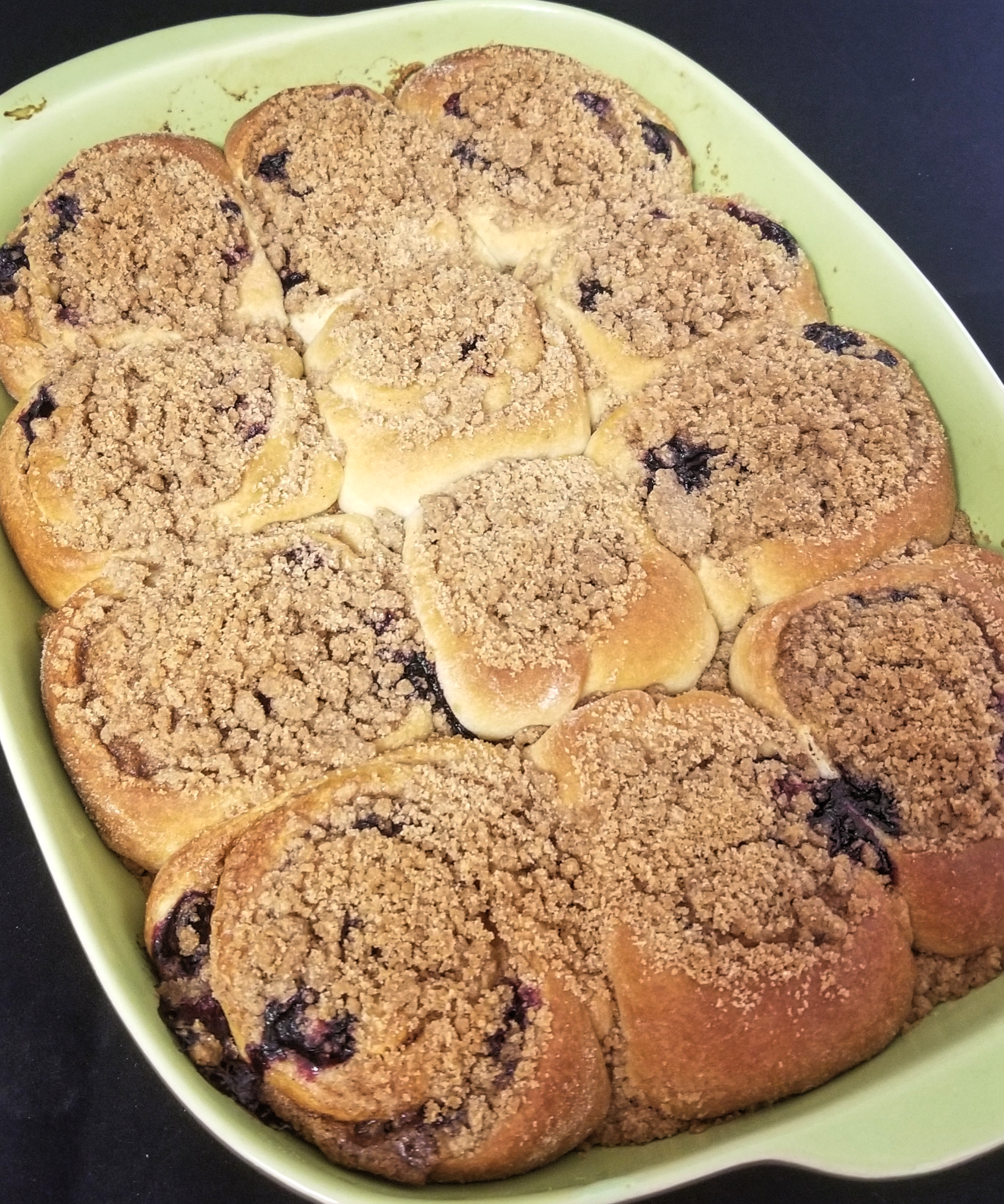 These rolls replace the dense cake with a light, yeast dough — but the same filling and blueberries are swirled through the rolls and they’re topped with a streusel — even more delicious cinnamon and sugar.