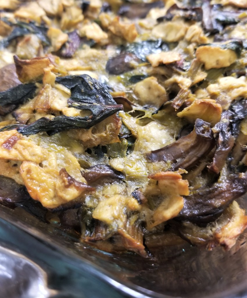 Years ago another website asked me to write some different stuffing recipes for Passover. I kind of forgot about those recipes, but as I was scrolling through the files on my computer I rediscovered them and decided they’d all easily be converted into kugel recipes and reworked them. If you’ve tried my Mushroom and Onion Kugel, this is similar, yet different. Using leeks and Swiss chard with the mushrooms and adding a couple of garlic cloves results in a slightly more complex kugel.