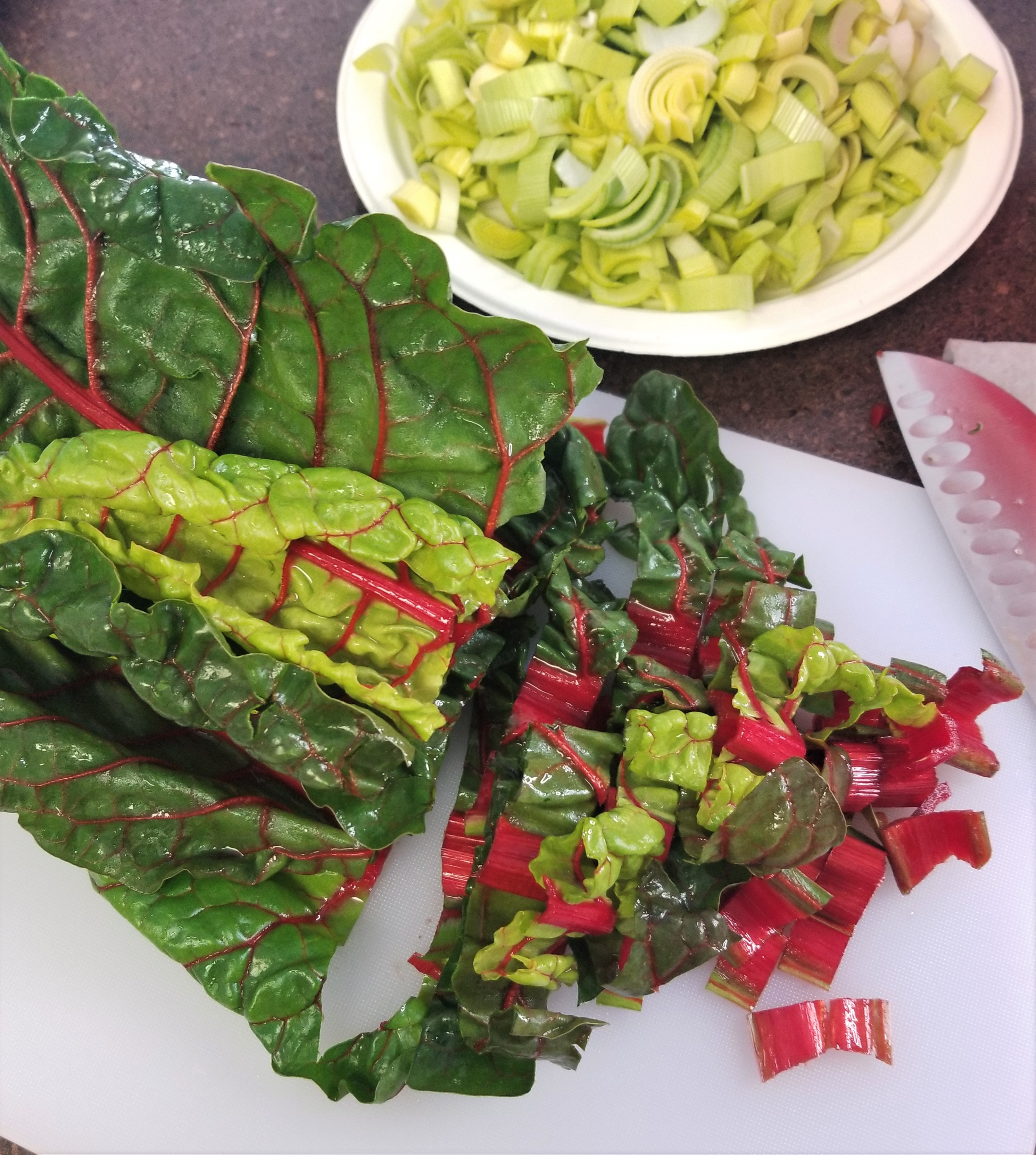 - 227 grams / 8 oz Swiss chard leaves, sliced 1-cm / 1/2″ thick (4 cups packed)