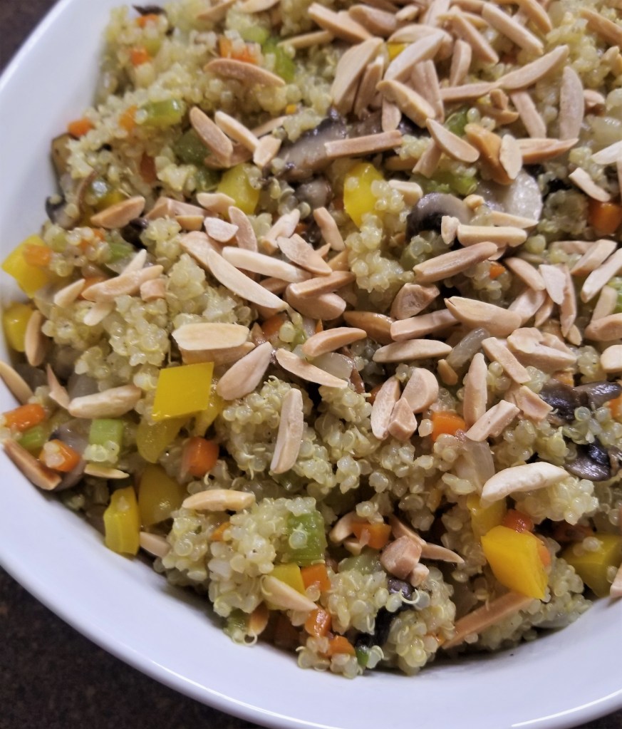 Add the quinoa to the vegetables and mix through. If your pan isn’t large enough, you can transfer everything to a large bowl and mix together. Add 1/2 cup of the toasted almonds and stir through. Transfer to a serving dish and sprinkle the remaining 1/4 cup of almonds on top.