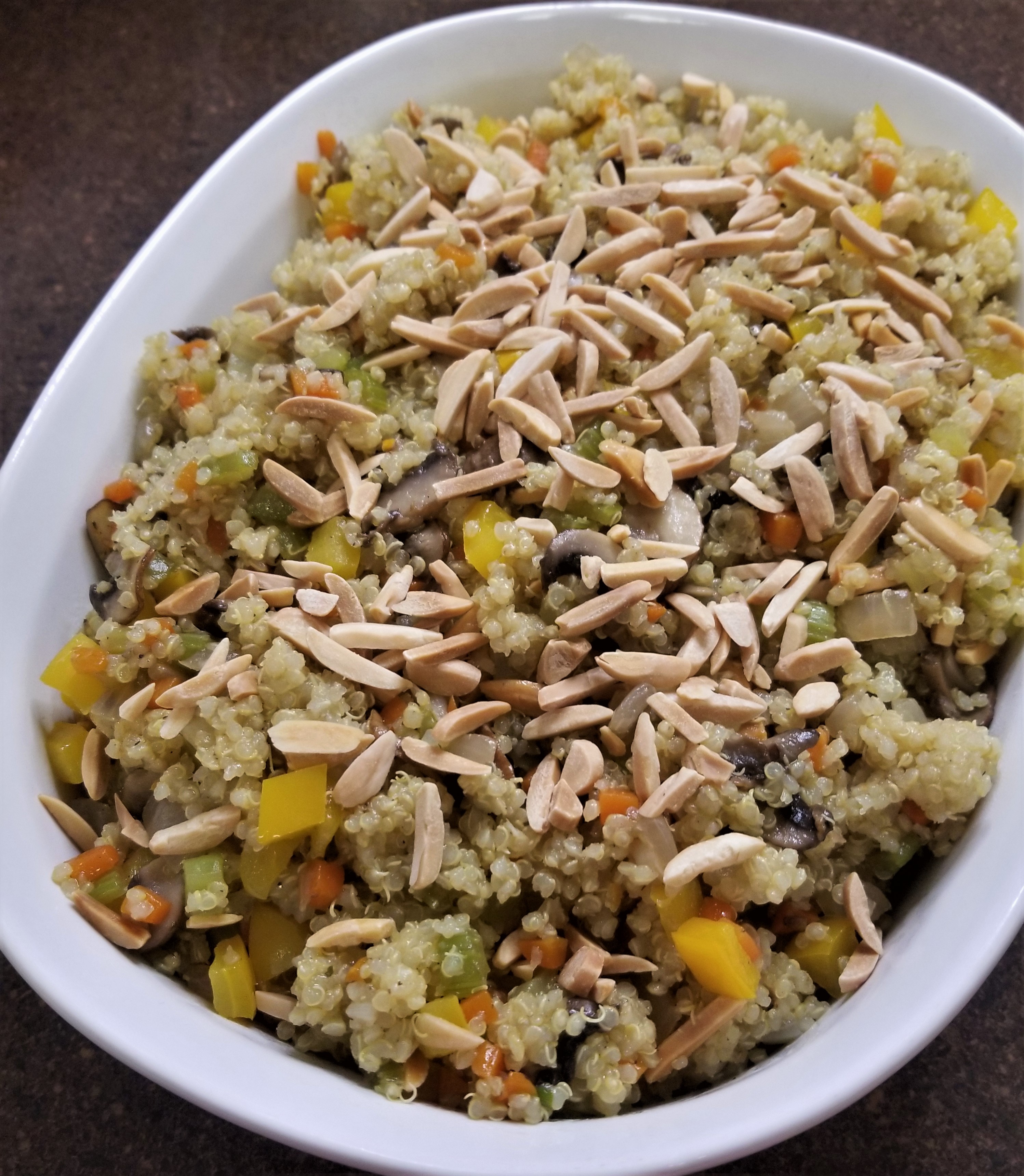 Add the quinoa to the vegetables and mix through. If your pan isn’t large enough, you can transfer everything to a large bowl and mix together. Add 1/2 cup of the toasted almonds and stir through. Transfer to a serving dish and sprinkle the remaining 1/4 cup of almonds on top.