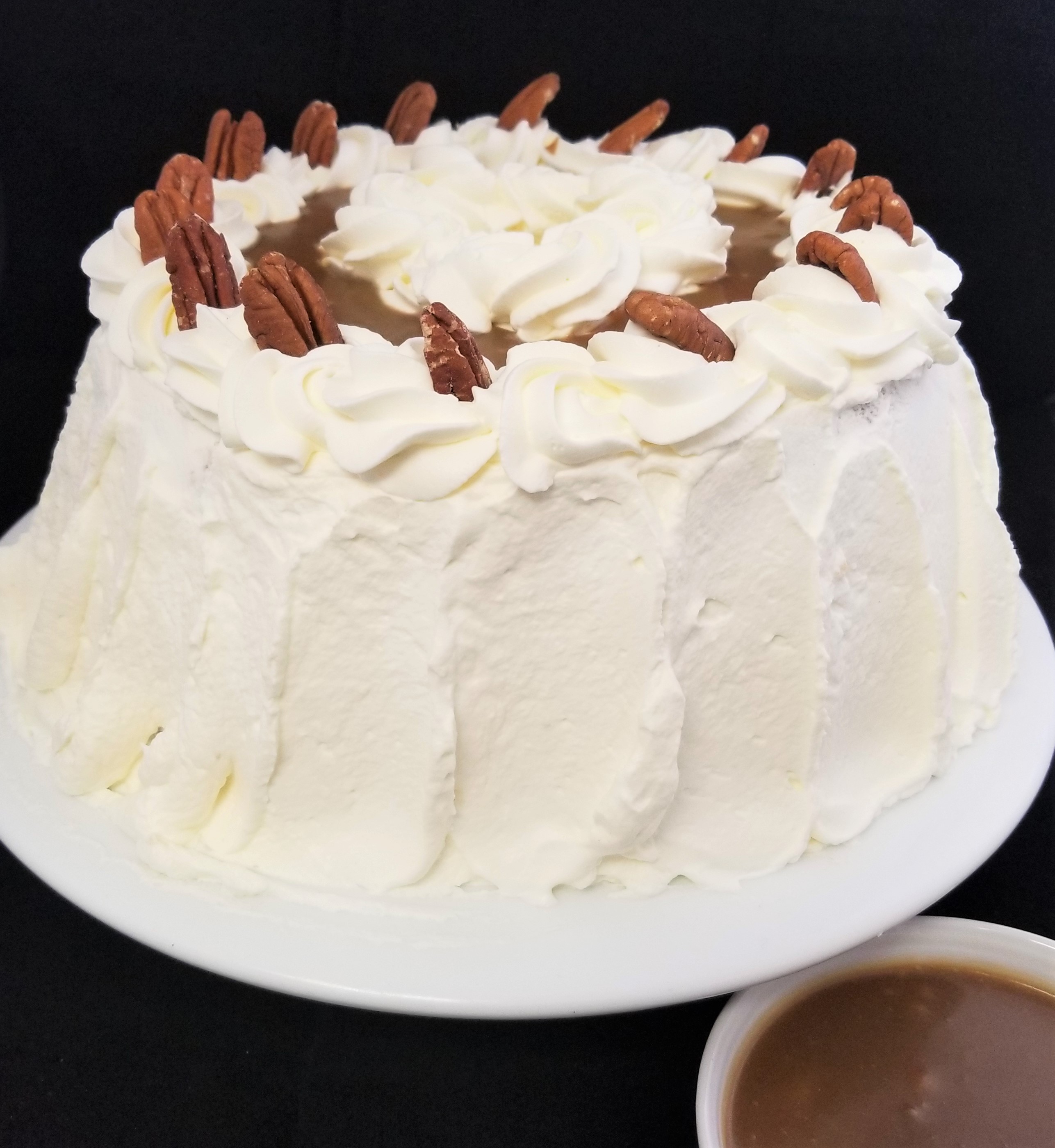 Place the next layer of cake on top, then another layer of whipped cream and more sauce. Place the top layer of cake on top, then carefully cover the cake in whipped cream. You can decorate this any way you like. I make sure the entire cake has a good layer of whipped cream, then pipe rosettes on the top of the cake, making two circles and forming a channel to fill with the caramel sauce. Then decorate with lightly toasted pecans.