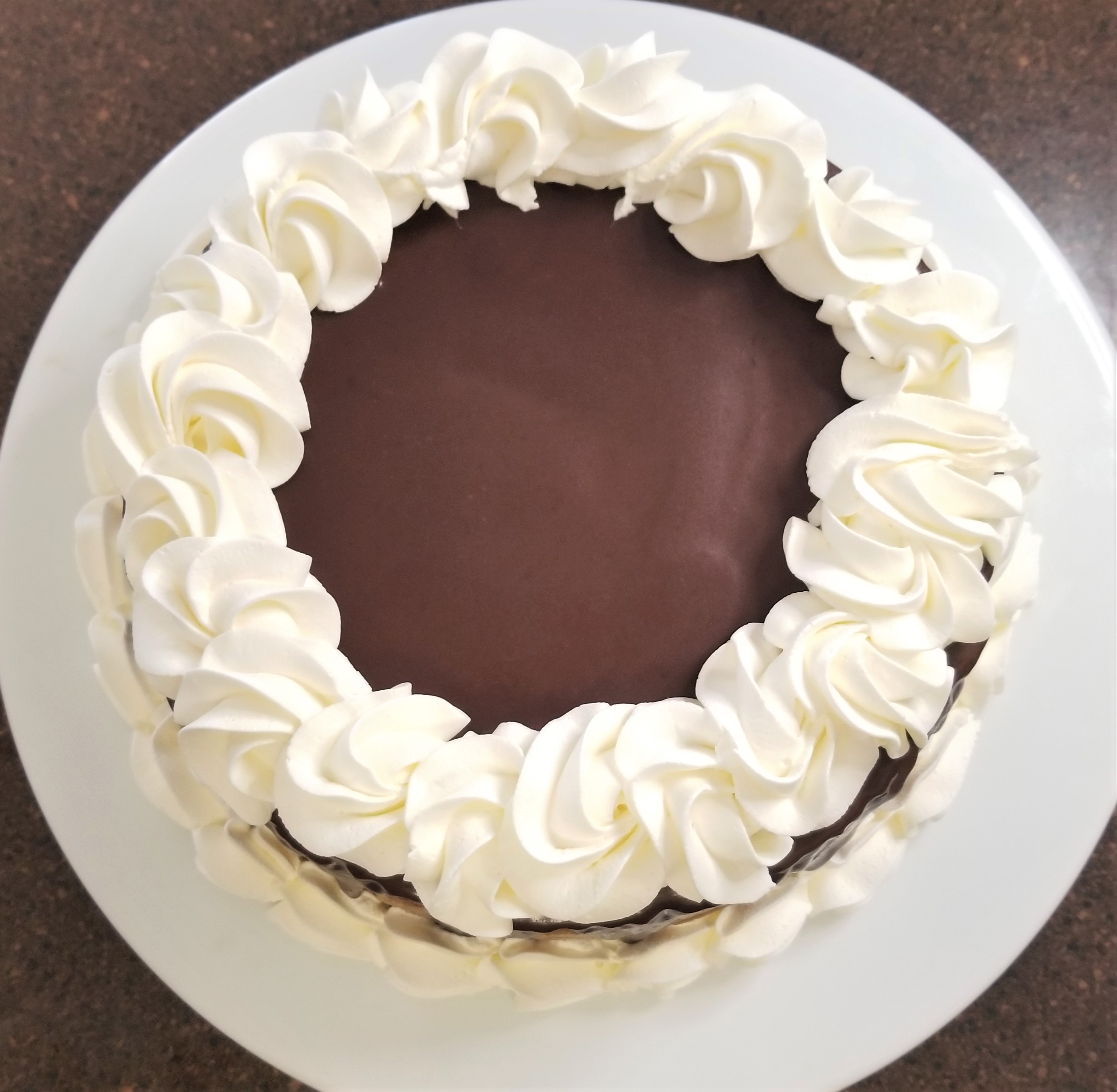 Whip the whipping cream, icing sugar and vanilla on medium, until stiff peaks form, being careful not to over-whip it (if you go beyond stiff peaks it will separate and turn into butter). Use a spatula to transfer the whipped cream to a pastry bag with a decorative tip in it and pipe around the top edge of the cake and around the base.