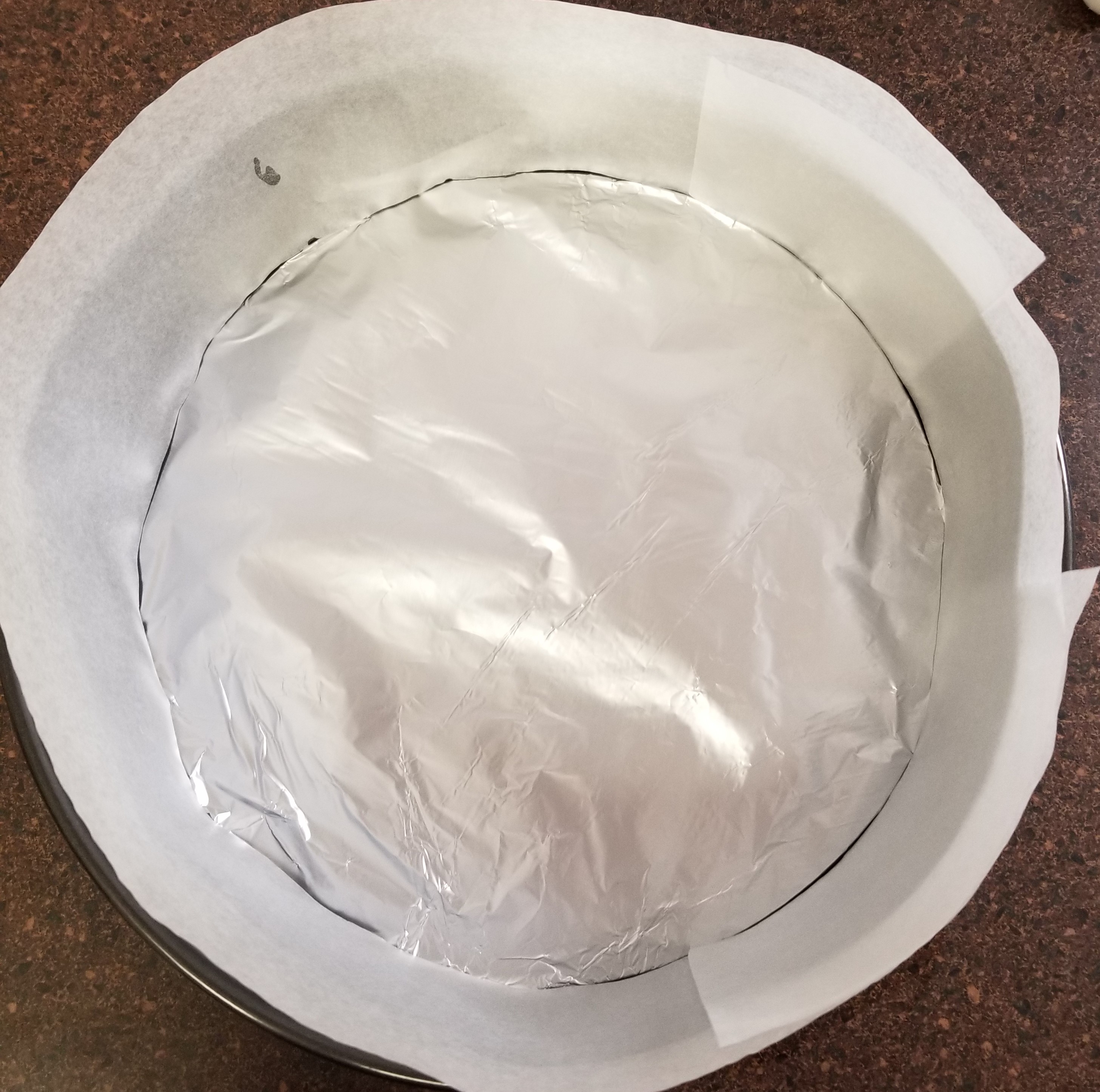 Take two sheets of aluminum foil and place the cheesecake pan on top of the sheets. Bring the aluminum up the sides of the pan, then place the springform pan in a roasting or baking dish and place on the middle rack of your oven. Carefully pour the boiling water into the roasting/baking dish so that it comes half-way up the sides of the springform.