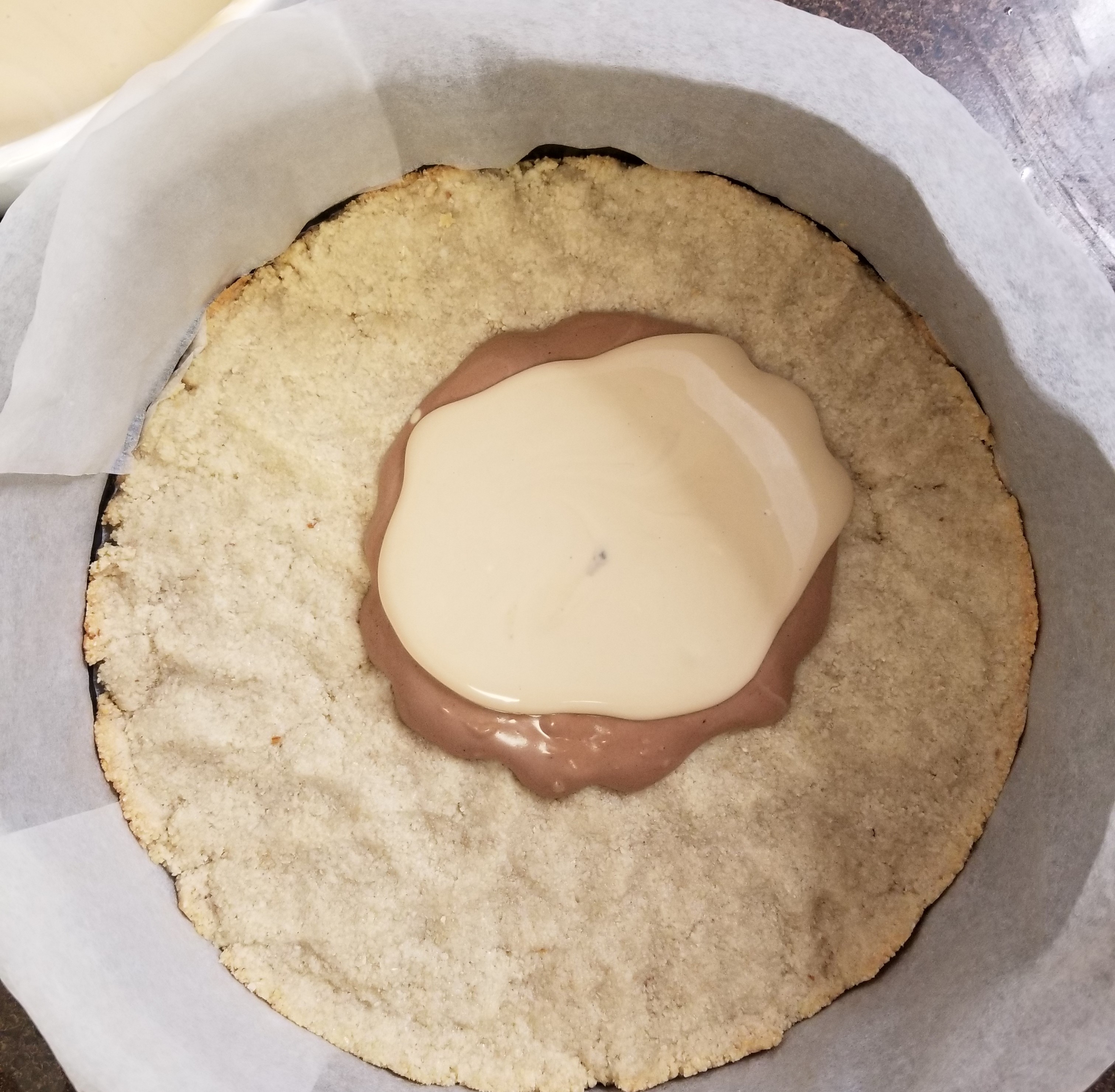 Divide the cheesecake batter equally into two bowl. In a smaller mixing bowl, whisk the cocoa powder together with 5 Tbsp. of whipping cream, making sure you eliminate any clumps of cocoa. Whisk the cocoa mixture into one bowl of cheesecake batter, then add the melted chocolate to this bowl and whisk it in well.