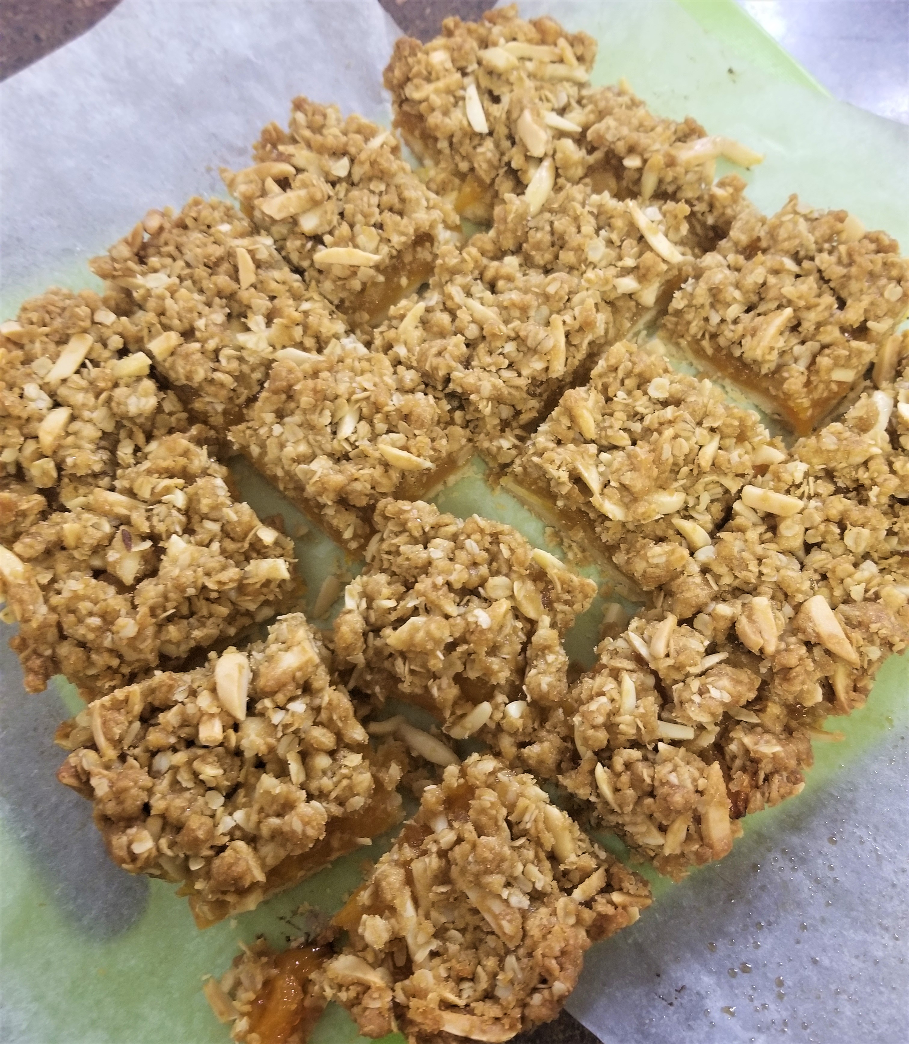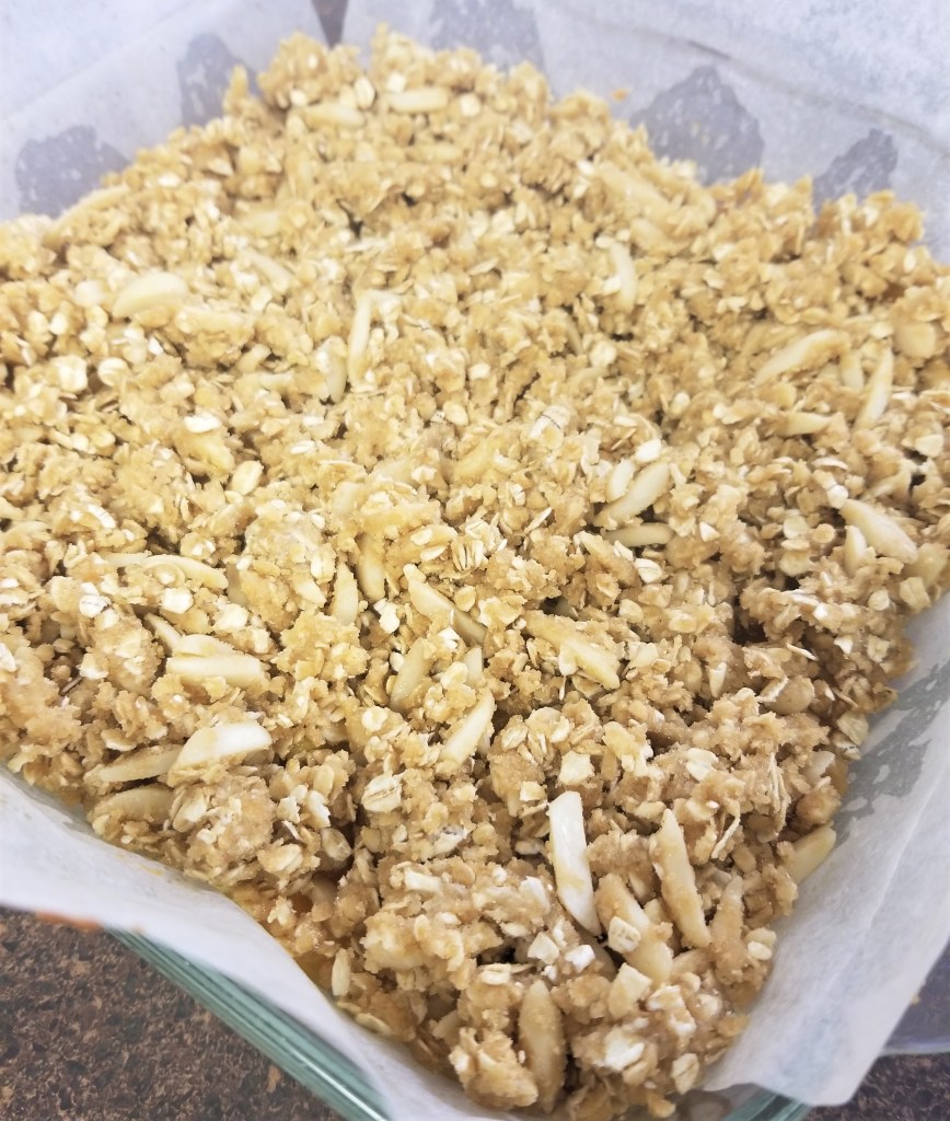 Bake for 30-35 minutes, until the topping is golden brown. Cool completely, remove from the baking dish and cut into 16 pieces (4×4). You can wrap well or transfer to an air-tight container and keep on the counter for a few days, or wrap well and freeze.
