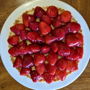 - Arrange the strawberries on top of the pastry cream, starting from the outer edge and working your way towards the centre.