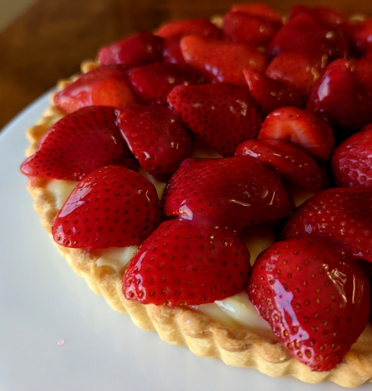 Lightly sweetened shortcrust filled with vanilla pastry cream and topped with fresh strawberries. A perfect summer dessert.