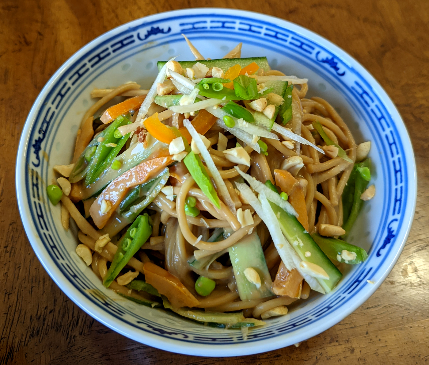 A great cold pasta salad that works well as a side or as a light lunch. Creamy peanut butter, salty soy, toasty sesame, tangy lime and a little heat from the hot sauce and ginger - a delicious sauce that coats pasta and lots of fresh, crispy vegetables.