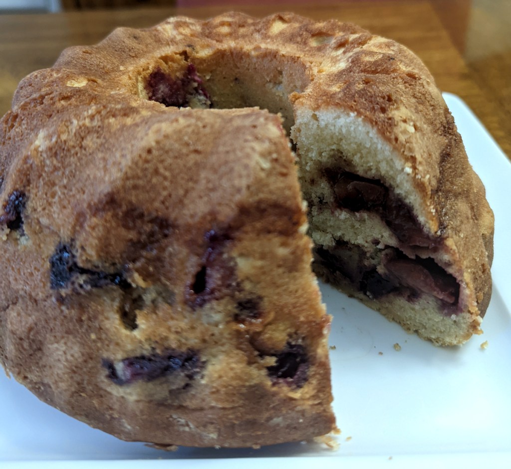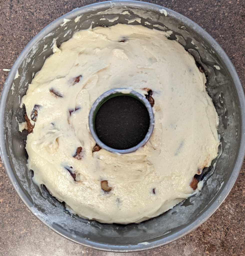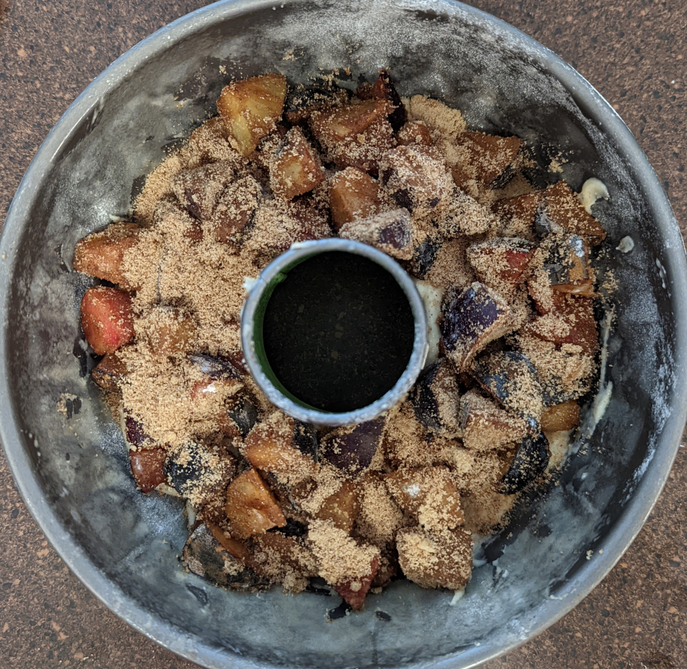 - Use a spatula or two spoons to transfer one-third of the cake batter to the prepared bundt pan, smoothing it out into an even layer. Add one-half of the plums to the pan, making sure you add half of the flour/cinnamon/sugar mixture with them. Add another one-third of the cake batter on top of the plums, smoothing it out with a spatula and then add the rest of the plums and the flour/cinnamon/sugar. For the final layer, add the rest of the cake batter, smoothing it out. If a few pieces of plum peak out from the batter, that’s okay.