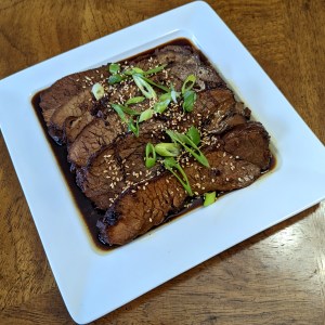 Slow-cooked brisket flavoured with soya sauce, honey, garlic and onion soup mix. Easy to make and delicious!