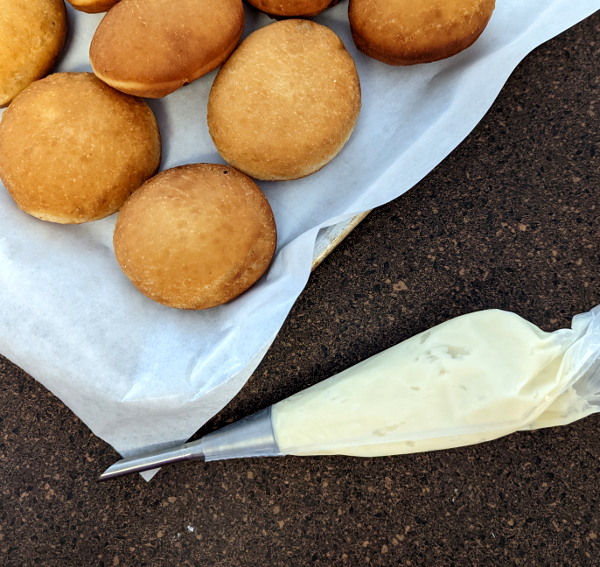 For filling, I use Bismark piping tips. The pointed edge of the tip lets you pierce the doughnut without having to use a knife to pierce it first. The length of the tip lets you get the filling right into the centre of the doughnut. For some thicker fillings like jams or ones that contain solid items like coconut, use a tip with a wider opening so the filling doesn’t get stuck. If you don’t have these tips, use a plain round piping tip and a sharp paring knife to make a small hole in the doughnut that will help you insert the tip into the doughnut.