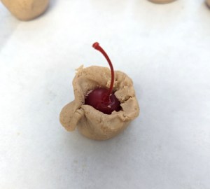 - Use a small scoop or measuring spoon to scoop out approximately 1 Tbsp. of the peanut butter mixture. Roll it into a ball and flatten slightly into a circle. (If the mixture is too soft for you to work with, mix in a little more sugar.) Place one cherry in the centre of the circle and bring the peanut butter circle up the sides of the cherry, wrapping it completely, with the stem sticking out the top. Gently roll the cherry in your hands, forming a smooth ball. Place the cherry on a parchment-lined tray and continue with the rest.