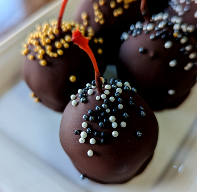 - One at a time, dip the cherries in the chocolate, making sure the whole cherry is submerged. Lift the cherry out and let the excess drip off. Place on a parchment-lined tray and lightly sprinkle with the sprinkles if using. Continue until they’re all done. Refrigerate until the chocolate has hardened.
