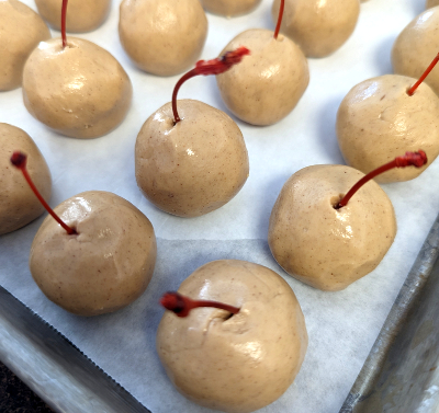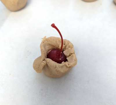 - Use a small scoop or measuring spoon to scoop out approximately 1 Tbsp. of the peanut butter mixture. Roll it into a ball and flatten slightly into a circle. (If the mixture is too soft for you to work with, mix in a little more sugar.) Place one cherry in the centre of the circle and bring the peanut butter circle up the sides of the cherry, wrapping it completely, with the stem sticking out the top. Gently roll the cherry in your hands, forming a smooth ball. Place the cherry on a parchment-lined tray and continue with the rest.