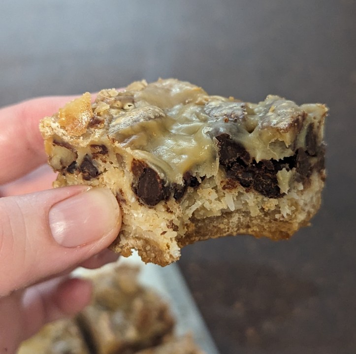 You can also play around with the layers. My version has crust, coconut, chocolate chips, pecans, and the milk/cream mixture. You can use different nuts, different types of chocolate chips or chopped-up chocolate bars, dried berries, or anything else you think will taste good.