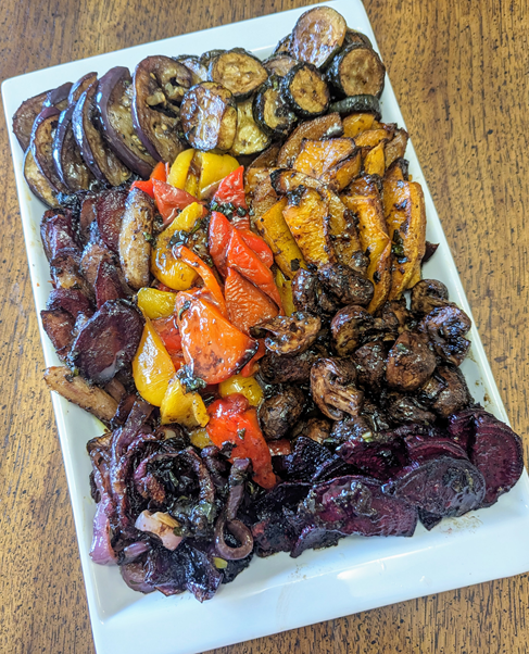 - Once all of the vegetables are done and on the serving platter, whisk the marinade that you set aside and drizzle over the platter. Toss each section gently. Taste the vegetables to check for seasning and add salt and pepper if necessary.