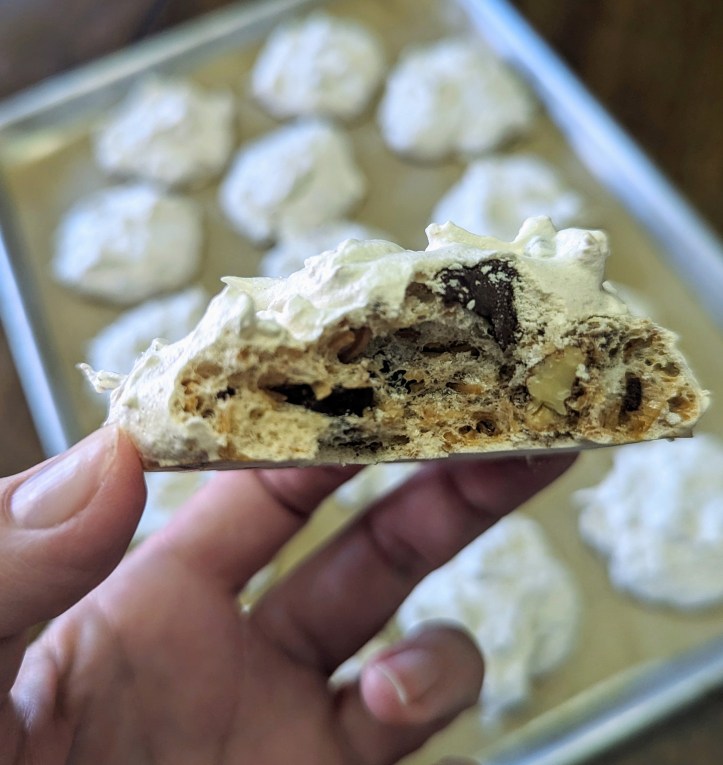 Back then, I’d bake plain meringues, chocolate chip meringues and sometimes add toasted almonds. Several years ago, after a week of baking different things, I had small amounts of toasted pecans, toasted coconut, and chocolate chips left over and I threw them into a batch of meringue and discovered my favorite combination. The only thing I’ve changed is adding more of each of those ingredients, so I get lots of toasted pecans, coconut, and chocolate chips encased in crispy meringue. You can replace any of these things with different nuts or chocolates (chips or chopped-up chocolate bars).
