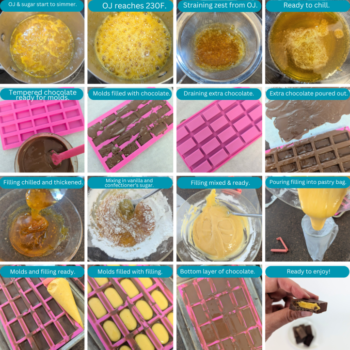 Every year I bemoan the loss of the orange filled chocolates. This year I decided I’d try making them myself. I started reading recipes for filled chocolate bars but nothing I read worked for Passover, so I started experimenting. I think it was the third batch that made me stop in my tracks. It’s been many years since I tasted one, but mine tasted so familiar and so good.