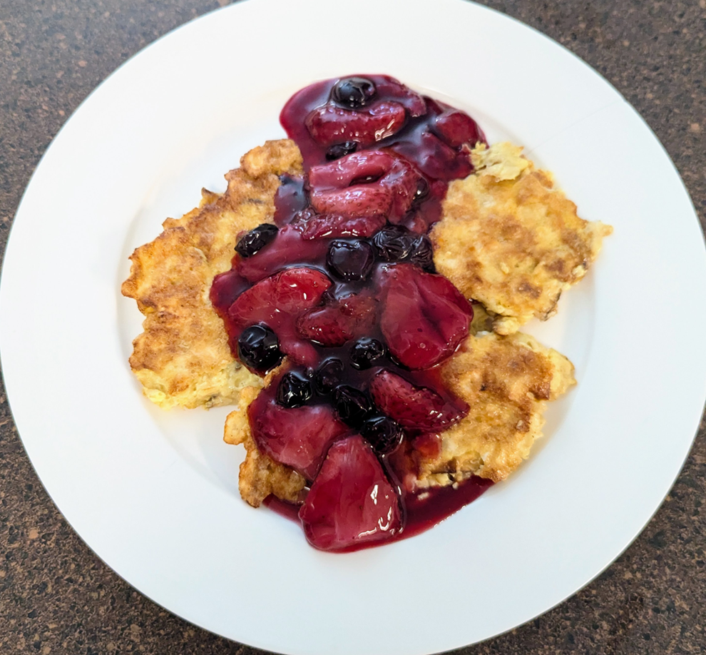 There are many different ways to make Matzo Brei, and my preferred method is to break the matzo into pieces, soak in hot water, drain, and then mix with eggs and salt. I then add it to a hot pan coated in butter and spread it out evenly, forming a pancake. Cook on both sides until golden brown and serve with something sweet: syrup, jam, or my favorite, strawberry and blueberries cooked with sugar and lemon juice until syrupy. (If your berries are very sweet, you can reduce the amount of sugar in the recipe.)