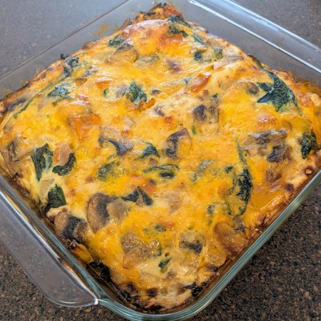Mushroom, Spinach, Pepper and Cheddar Matzo Strata